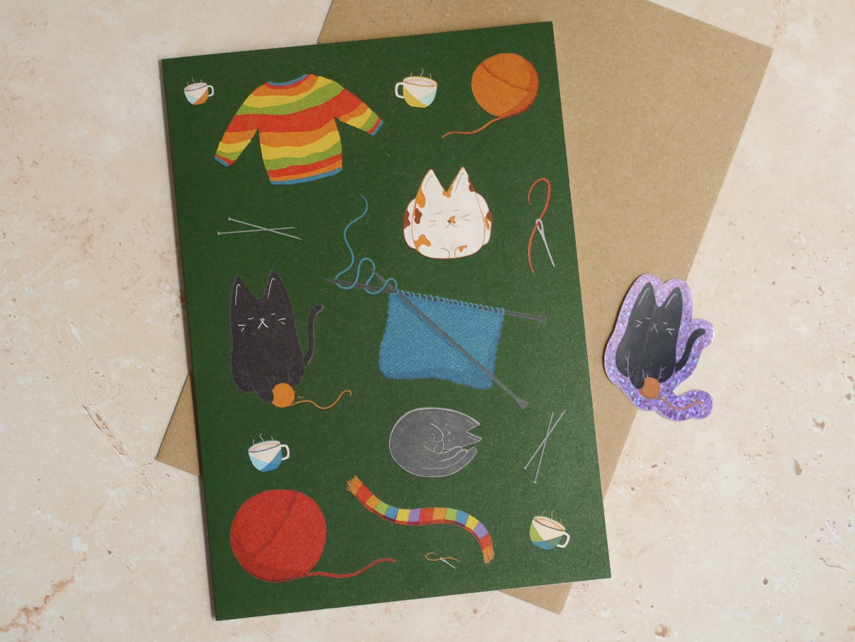 Knitting, Coffee & Cats - A5 Greetings Card