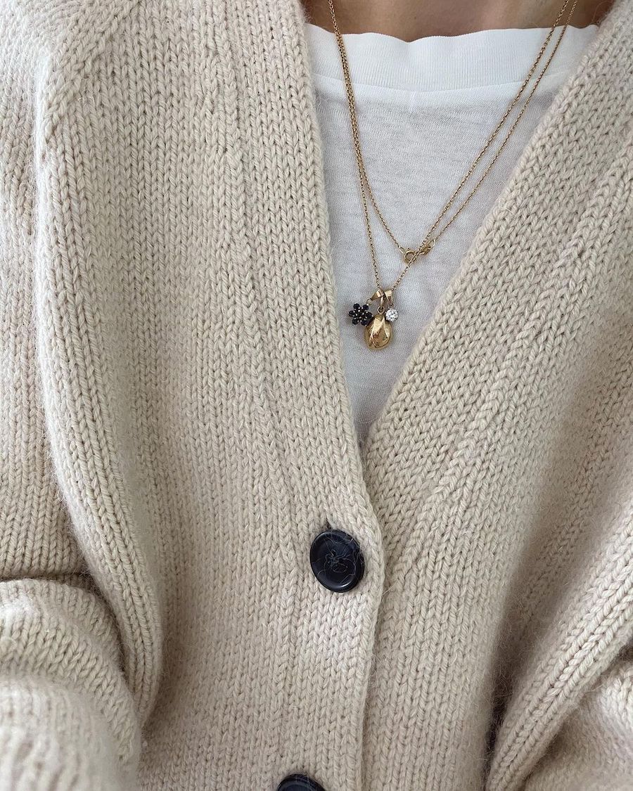 The white Champagne Cardigan is knitted in Double Sunday by Sandnes Garn in the color Almond [2511] held together with Tynn Silk Mohair by Sandnes Garn in the color Kitt [1015].