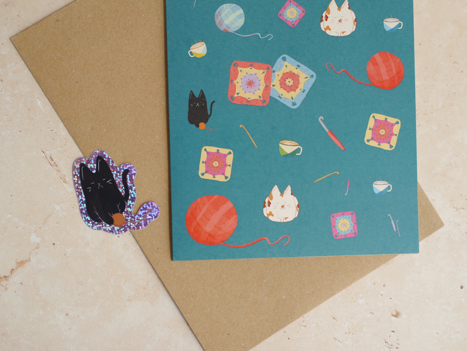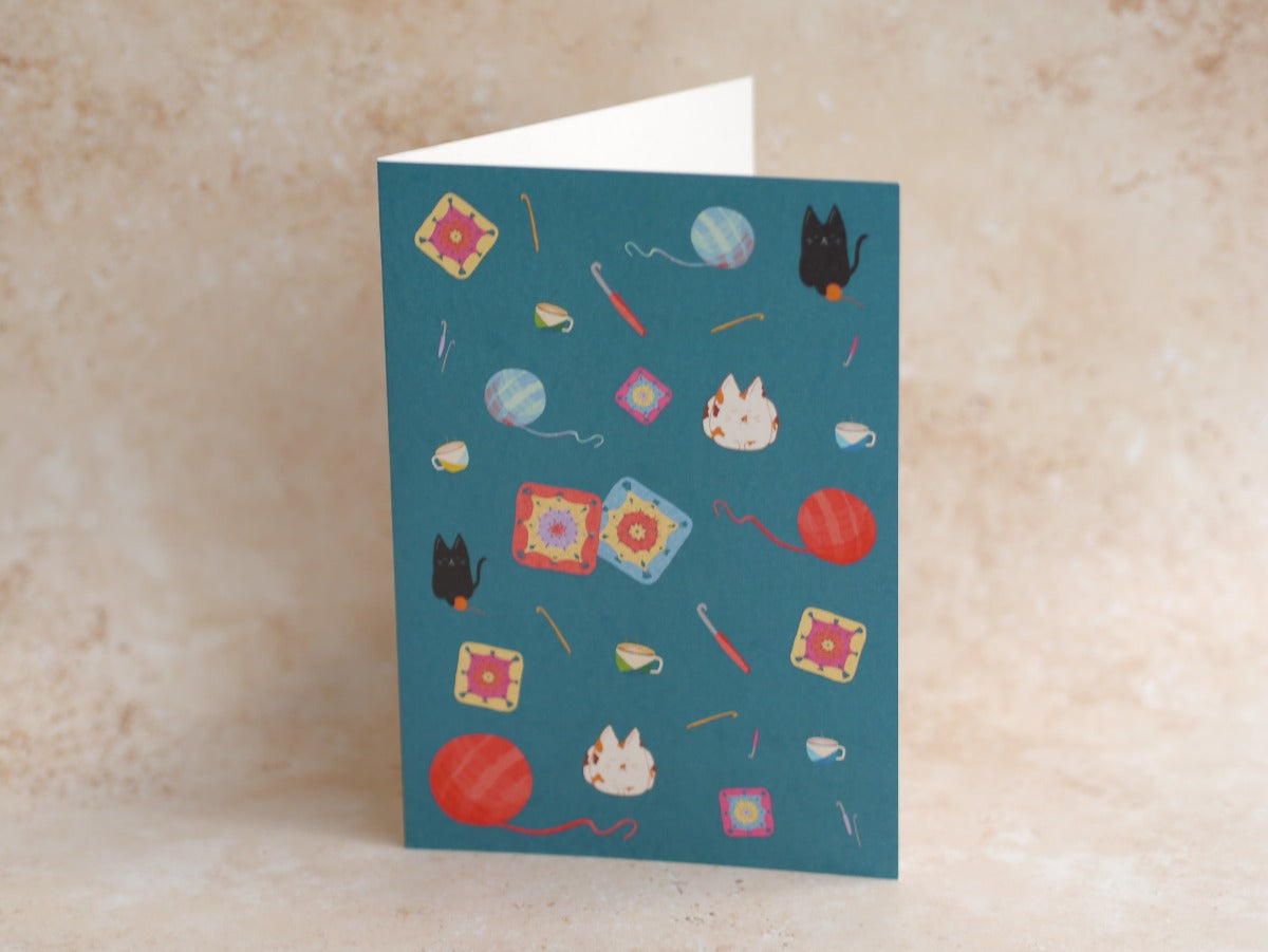 This gorgeous crochet greetings card has been hand designed for Plush Society by Feeling Fowl Designs, featuring cute cats, coffee, and of course lots of crochet :)