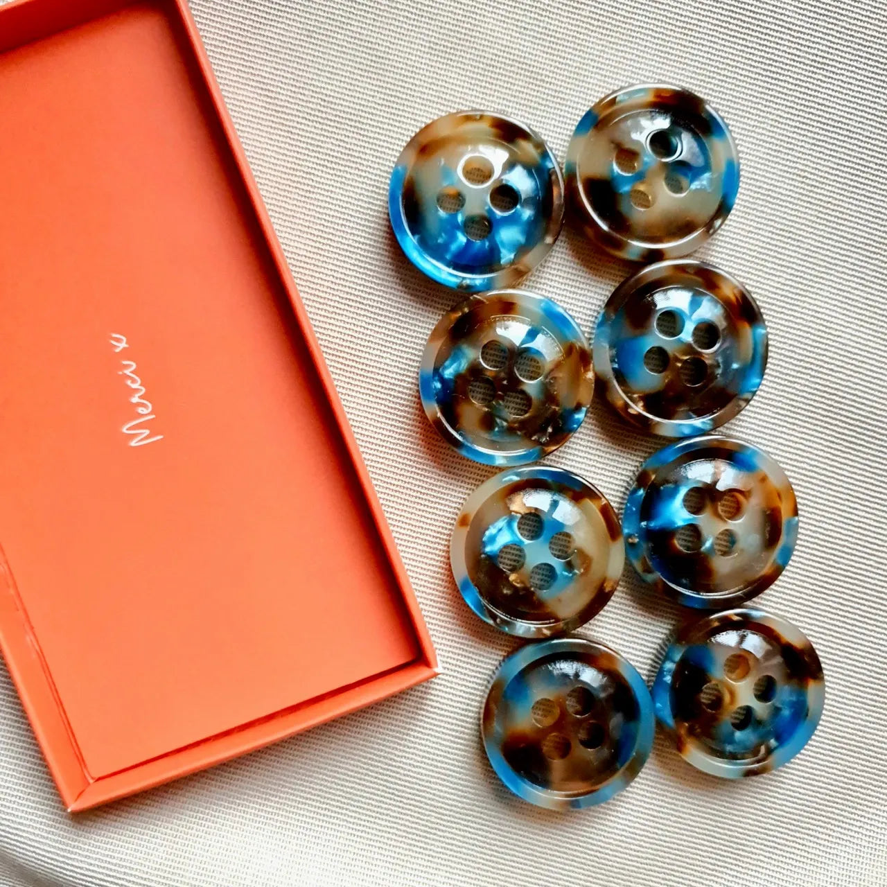 Bio resin behaves differently from plastic so rather than being placed into a mould, the buttons were laser cut into shape. Colours are embedded into the buttons (rather than painted on the surface) meaning not only are the buttons beautiful, they are also strong and hard wearing.