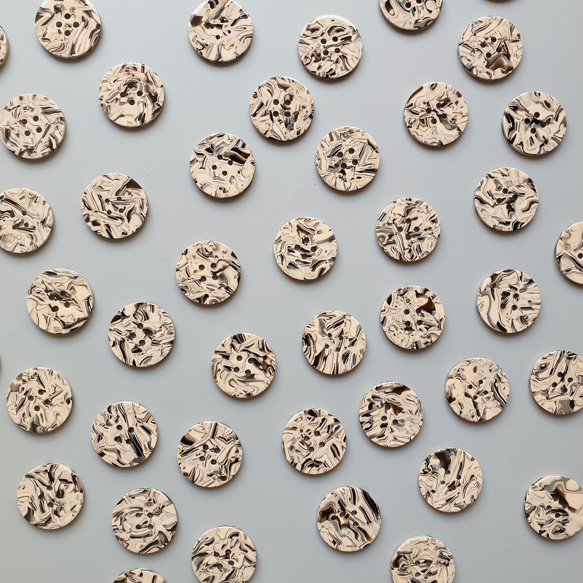 Bio resin behaves differently from plastic so rather than being placed into a mould, the buttons were laser cut into shape. Colours are embedded into the buttons (rather than painted on the surface) meaning not only are the buttons beautiful, they are also strong and hard wearing.