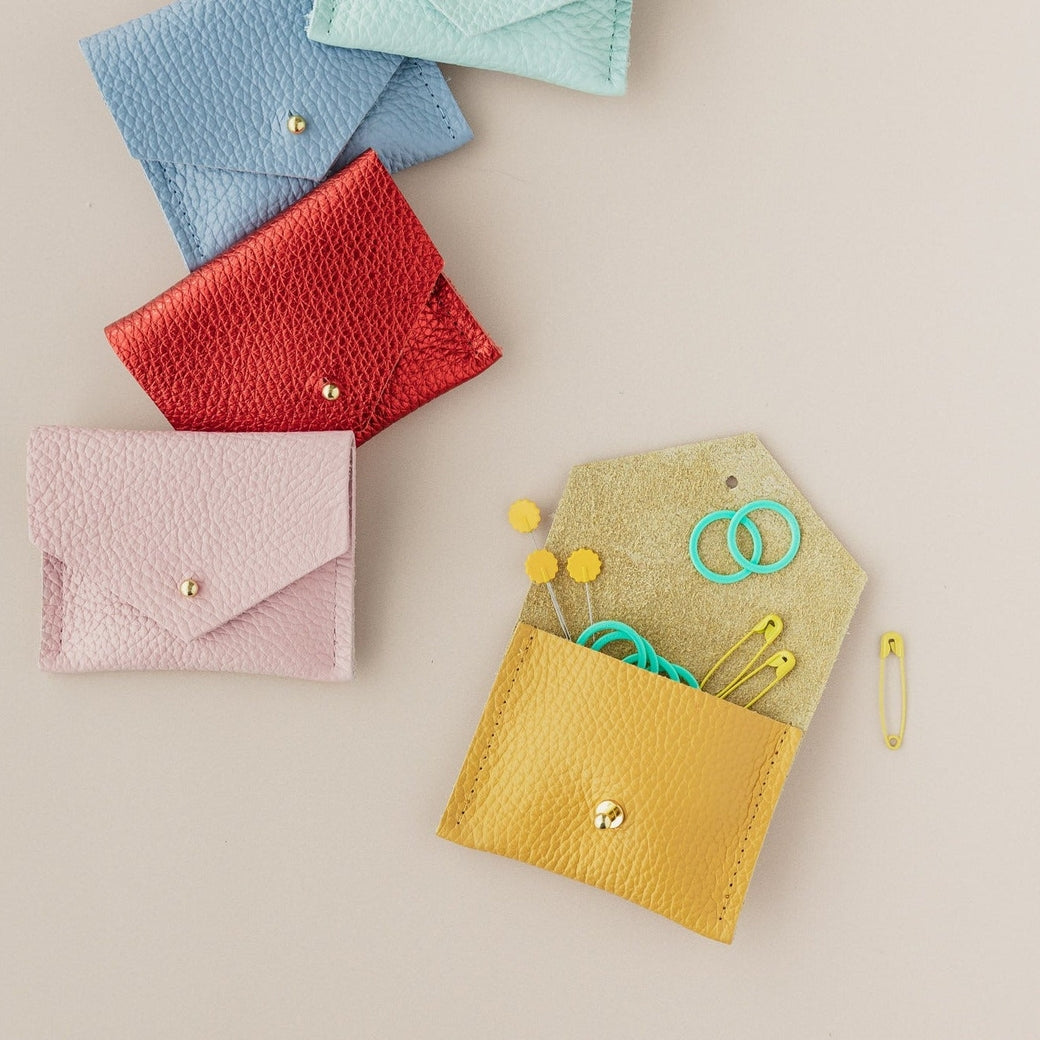 Construction: Each leather pouch is cut by hand before sewing together by machine. It is finished with a simple gold stud fastening. Note that no stitch markers are included.