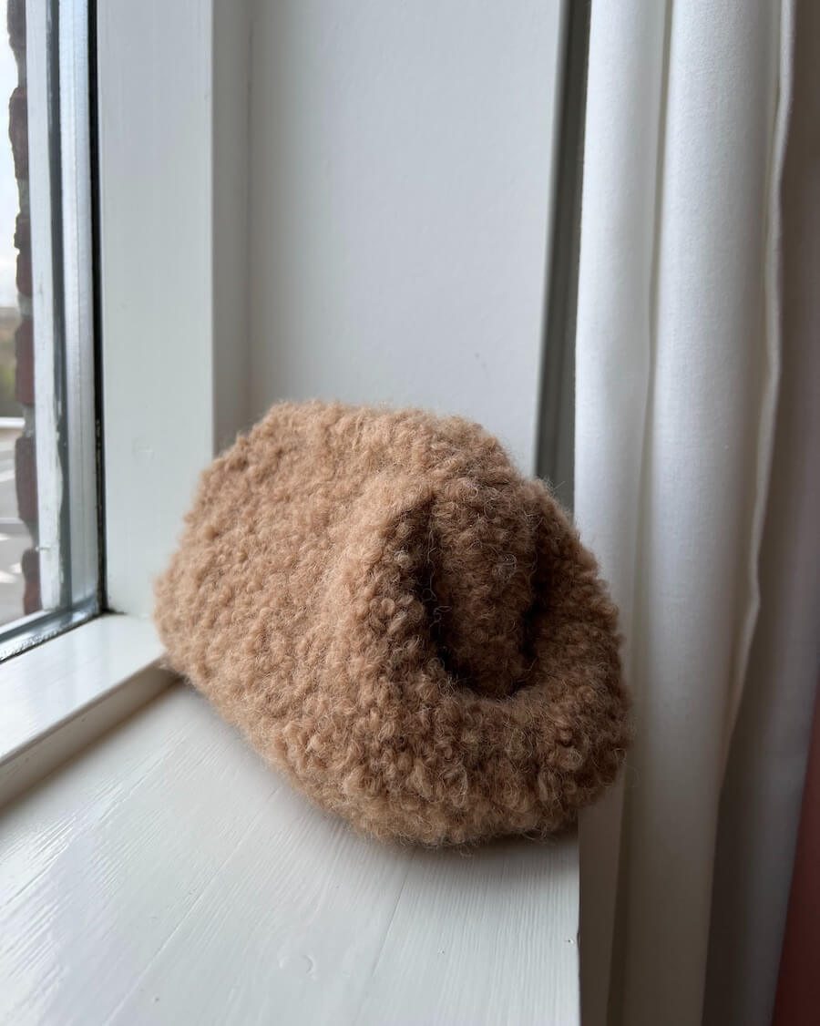 The brown Teddy Clutch is knitted in Teddy Dear by Gepard Garn in the color Beige [108].